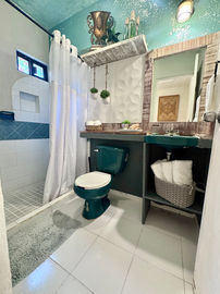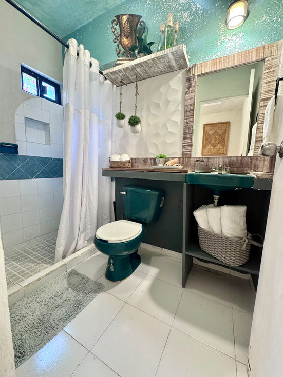 The upper level of The Atelier is entirely private and reserved exclusively for guests. This serene retreat features a thoughtfully designed bedroom with a queen bed, creating a comfortable and restful place to unwind.